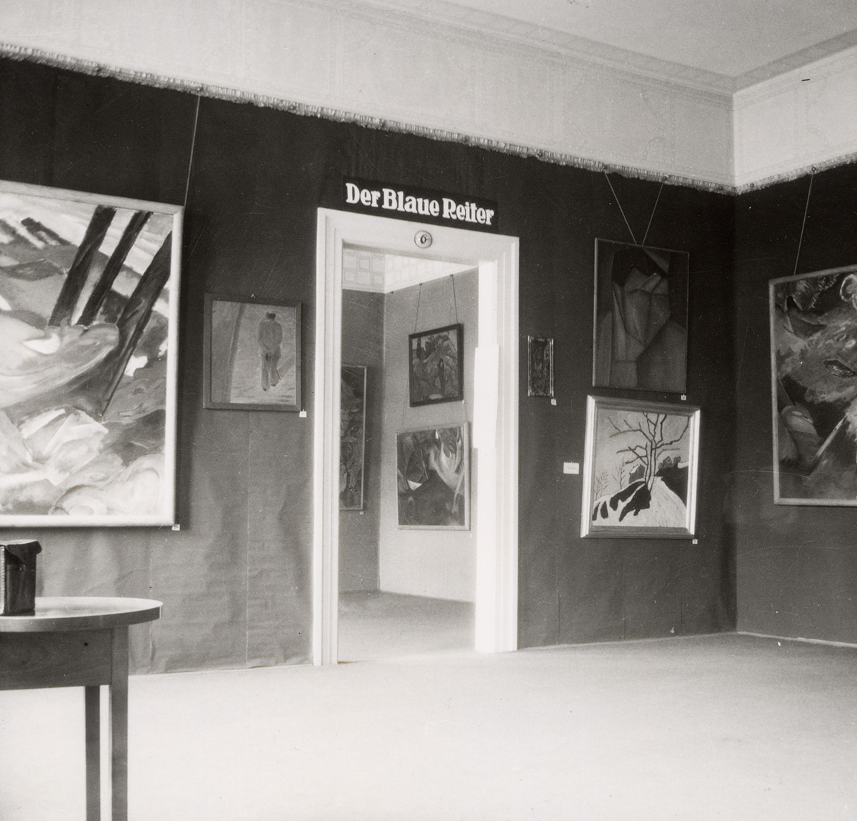 Ausstellung "Der Blaue Reiter", Moderne Galerie Thannhauser, München; Schönbergs »Gehendes Selbstportrait« ist links neben der Tür erkennbar.