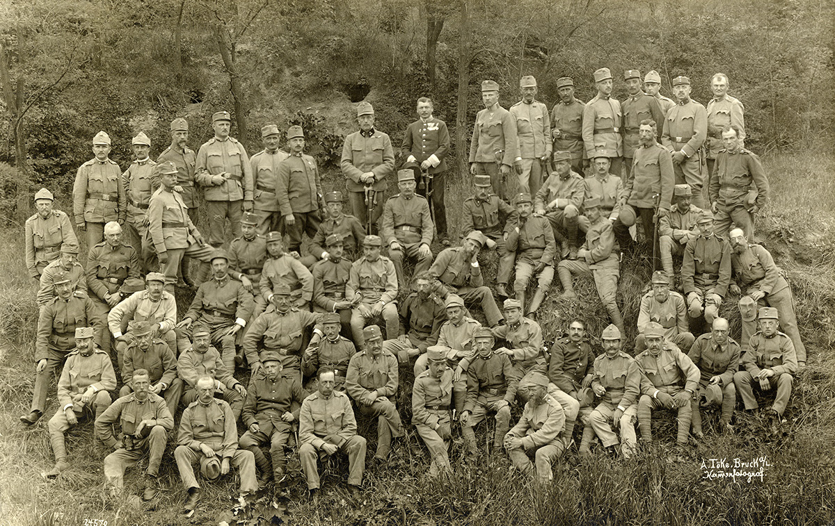 Arnold Schönberg (unten, 2. v. rechts) mit seinem Regiment, Bruck an der Leitha 1916