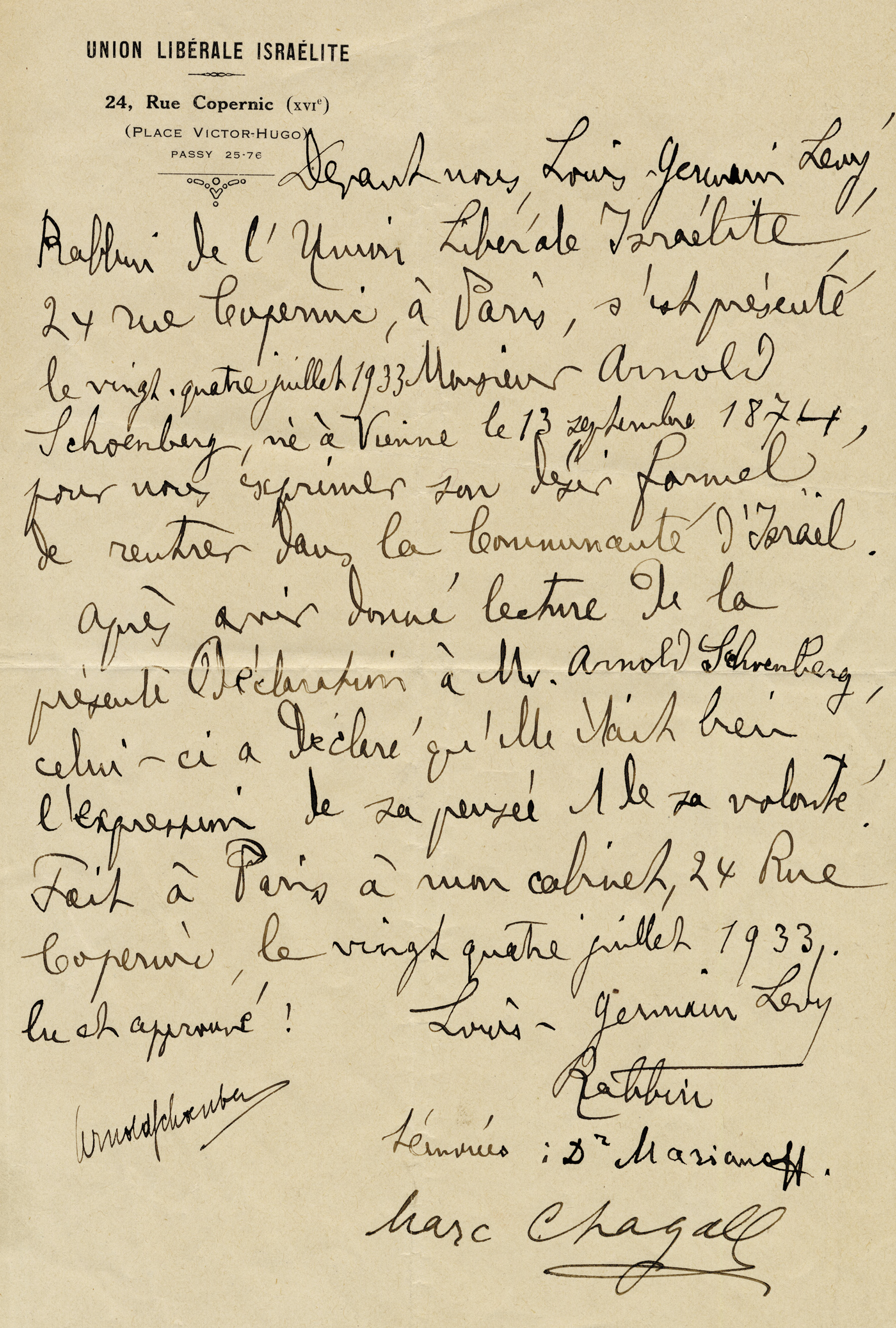 Schönberg, ursprünglich jüdischen Glaubens und später zum Protestantismus gewechselt, kehrte in Paris zum Judentum zurück. Dieses von einem Rabbi in Paris ausgestellte Dokument wurde u. a. von Marc Chagall bezeugt und unterschrieben.